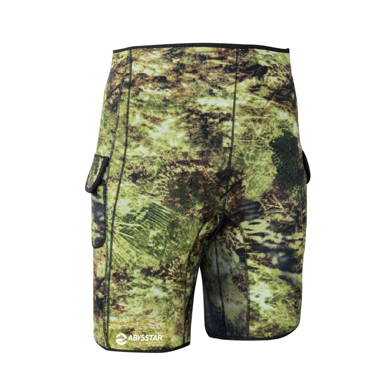 The Abysstar Evo Camo Bermuda Shorts are high-quality 3mm neoprene shorts designed for water sports and spearfishing. Crafted with high-quality Sheico/Ecoline neoprene, these shorts feature an innovative EVO-CAMOUFLAGE anti-tear nylon construction, enhancing stealth and durability in water. They have a double-lined design with a vivid 3D camouflage print mimicking Mediterranean seabeds for maximum concealment. Equipped with two utility pockets on each leg, these shorts improve thermal insulation, provide balance, and are ideal for active water sports enthusiasts seeking durability and stealth.