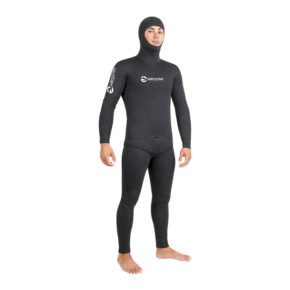 The Abysstar Pacific S/C Winter Wetsuit is a premium double-lined wetsuit designed for SCUBA diving and water sports in cold weather. It is crafted from high-quality Sheico/Ecoline neoprene with a thermal satin plush interior for exceptional heat retention and comfort. The exterior is made of abrasion-resistant nylon to ensure maximum durability. The suit features reinforced pads welded at cross seams and Supratex knee reinforcements for added protection. Elastic, soft, and ergonomically designed, it offers outstanding comfort and mobility. The two-piece design includes long john pants and a hooded jacket for comprehensive coverage and warmth.